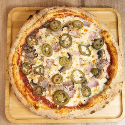 1. sos pom 2. ser mozzarella 350g/150g 3. pieczarki 40g/20g 4. papryczki jalapeno 50g/25g 5. boczek 80g/40g 6. szczypta oregano 7. pieprz
