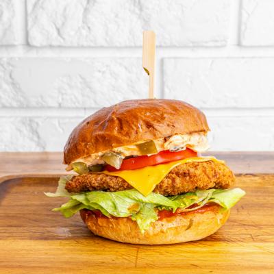 Panierowany filet z kurczaka, 2x cheddar, sos bufalo, pomidor, sałatka, sos firmowy z ogórkiem kiszonym.