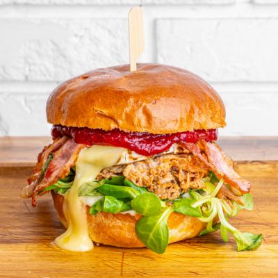 Szarpana wieprzowina 120g, dżem z żurawiny, camembert, boczek x2, rozpszonka, sos firmowy z parmezanem.