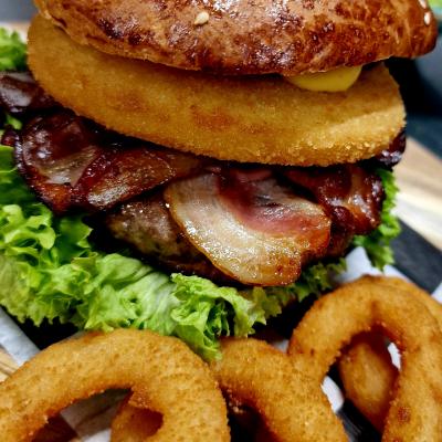 Bułka naszego wypieku, wołowina, ser panierowany, boczek, sałata, krążki cebulowe, ogórek, konfitura z czerwonej cebuli, sos serowy