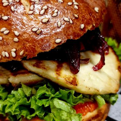Z grillowanym serem haloumi, grillowaną cukinią, dipem z pieczonych warzyw, karmelizowaną cebulą i frytkami z batatów