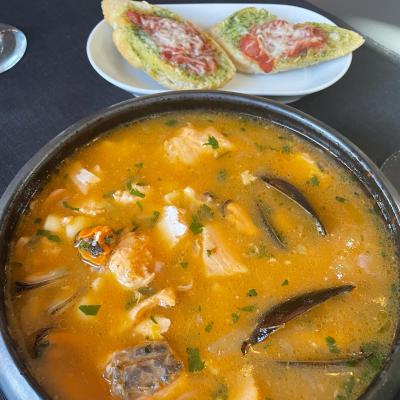 Z owocami morza podana z pomidorową bruschettą