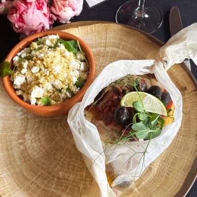 Pieczony w pergaminie, na pomidorze z oliwkami i kaparami, kolendrowym kuskusem i twarogiem