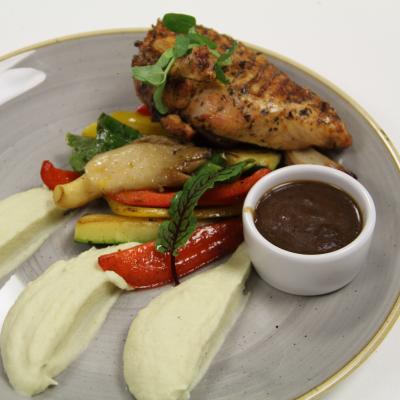 Supreme z lotką, z grillowanymi warzywami, puree pietruszkowym oraz sosem z miodu spadziowego