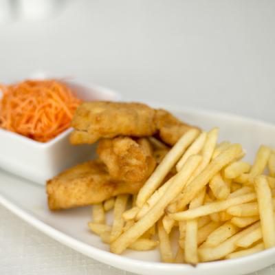 Nugetsy z kurczaka z frytkami i wiosenną surówką - danie dla dzieci