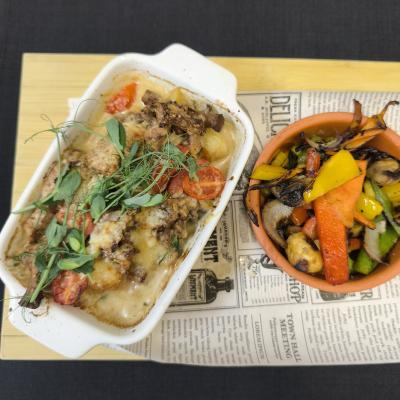 Zapiekana na domowym gnocchi z sosem kurkowym oraz grillowanymi warzywami