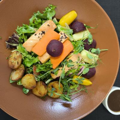 Sałatka z pieczonym łososiem, ziemniakami, warzywami okopowymi, z winegretem z oliwą z nasturcji