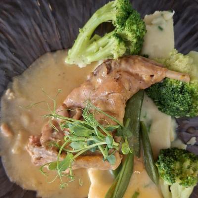 Duszony z w białym winie, z dodatkiem selera naciowego i tymianku podany z puree z groszkiem i młodymi warzywami