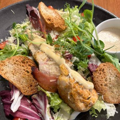 Grzankami pszennymi, serem corregio, chipsem z bekonu oraz sosem anchois