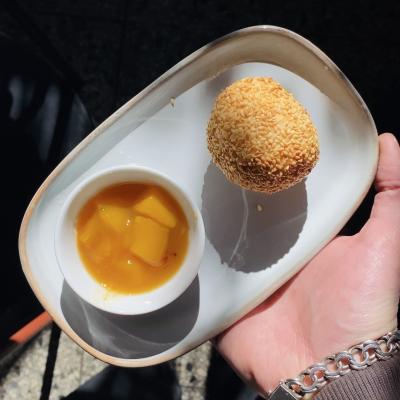 Chrupiąca, złocista kuleczka z kleistej mąki ryżowej z klasycznym słodkim nadzieniem z fasolki, obtoczona w sezamie. Jeden z najbardziej popularnych wietnamskich słodyczy, u nas przełamany kwaskową konfiturą z mango.