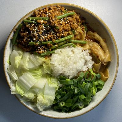 Podajemy z blanszowaną kapustą pekińską, tartą rzodkwią, dymką i roślinnym mięskiem mielonym z fasolką szparagową.