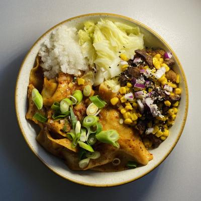 Podajemy z blanszowaną kapustą pekińską, tartą rzodkwią, dymką i sojowymi kawałkami mięska z kukurydzą.