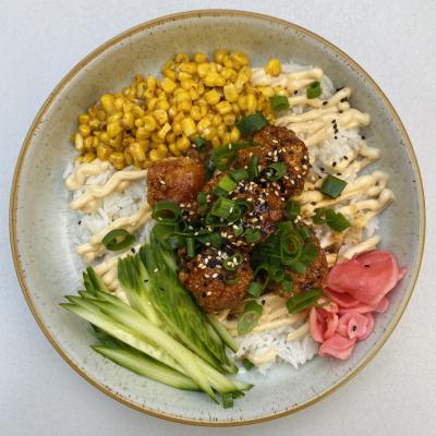 Donburi znaczy dosłownie miska ryżu, ale oczywiście liczą się dodatki. Delikatne tofu w chrupiącej panierce z dodatkiem naszego sosu teriyaki, do tego kukurydza z masełkiem miso, japoński majonez i świeży ogórek. To comfort food w japońskim stylu: prosty, ale pełen umami.