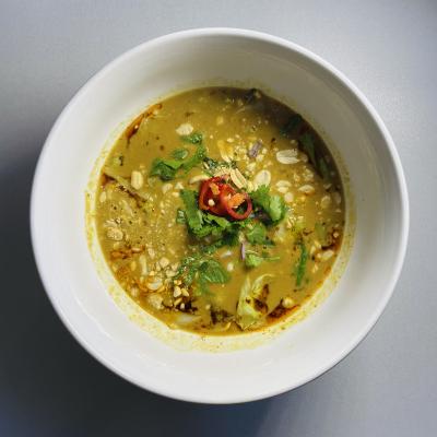 Inspirowana klasycznym massaman curry , połączenie głębokiego orzechowego bulionu oraz pierwszej młodej kapusty i podsmażonych ziemniaczków. Znajdziesz tu lekkie aromaty kolendry i trawy cytrynowej plus bogaty smak przypraw korzennych i kremowego masła orzechowego.
